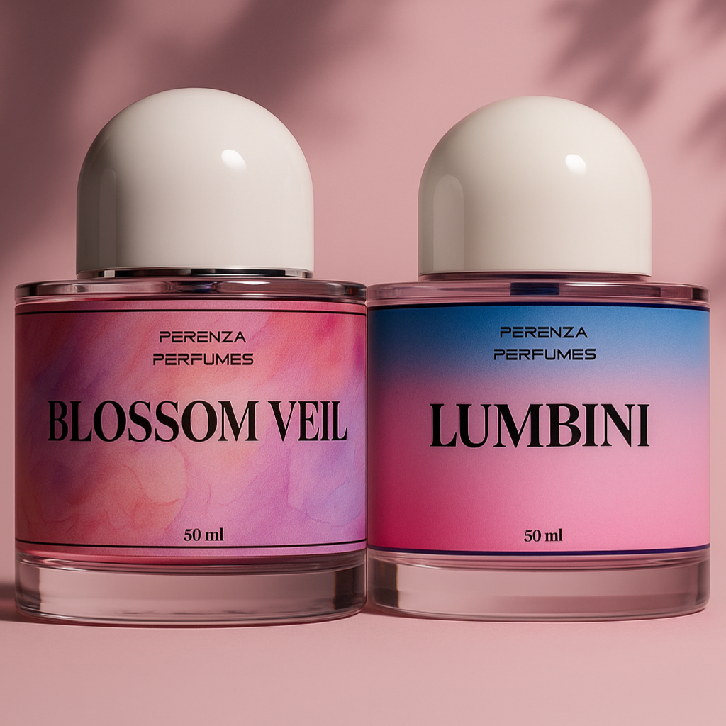 Embrace grace, charm, and timeless beauty with the Blossom Veil & Lumbini Bundle from Perenza Perfumes.
