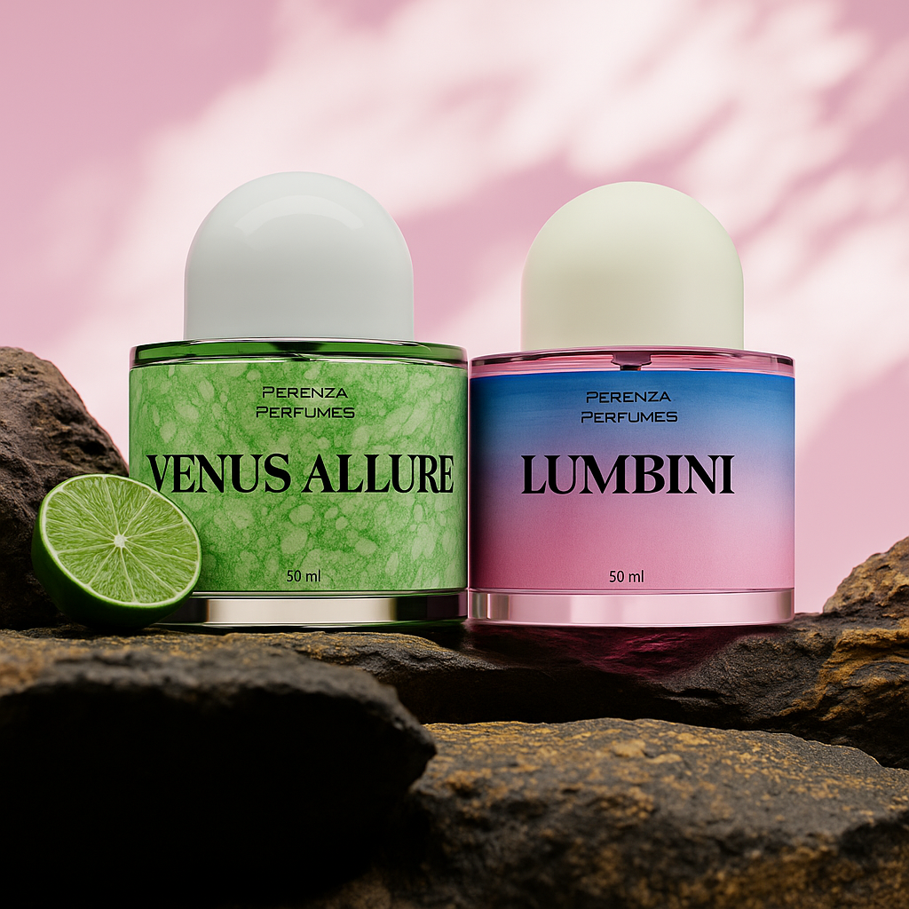 Embrace grace, freshness, and serenity with the Venus Allure & Lumbini Bundle from Perenza Perfumes.